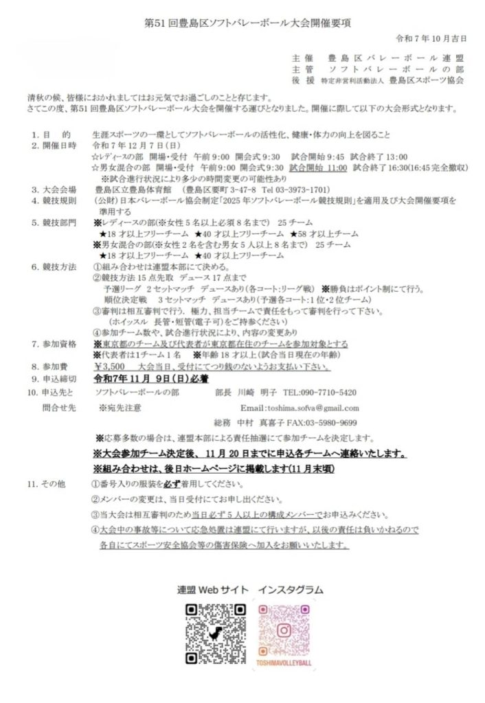 第51回ソフトバレーボール大会 開催要項 2025年9月23日 最終更新日時 : 2025年11月11日 豊島区 バレーボール連盟 開催日:2025年12月7日(日) 豊島体育館 第51回ソフトバレーボール大会開催要項ダウンロード Facebooktwitter