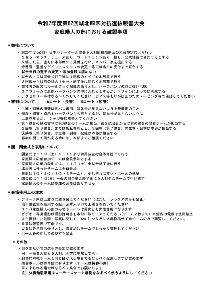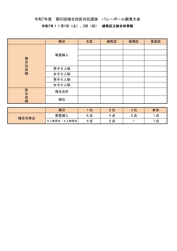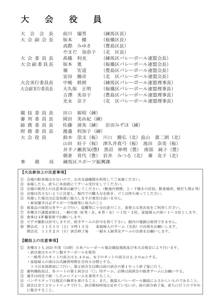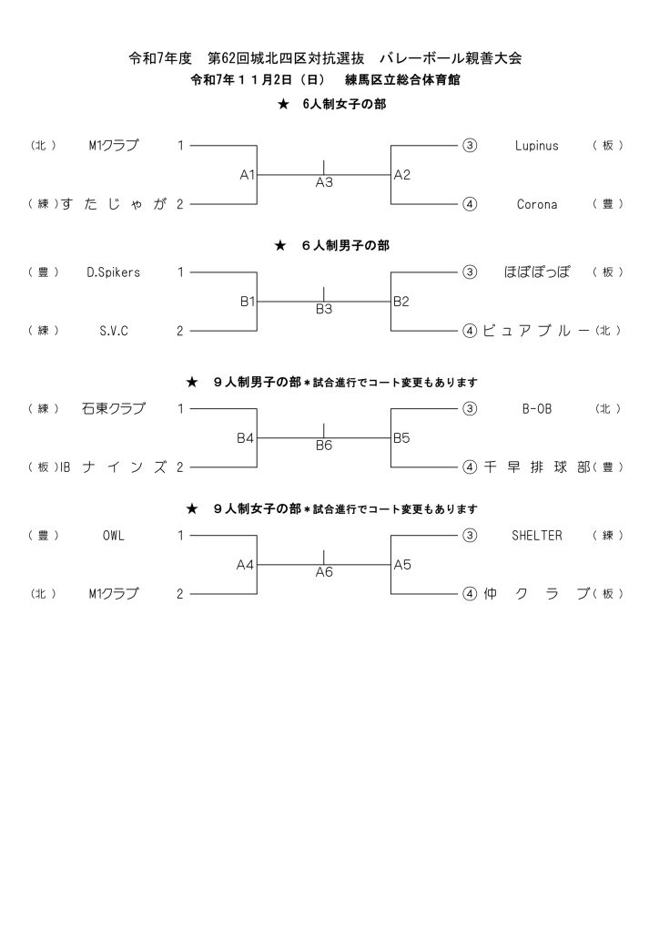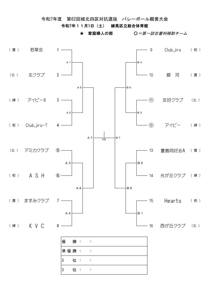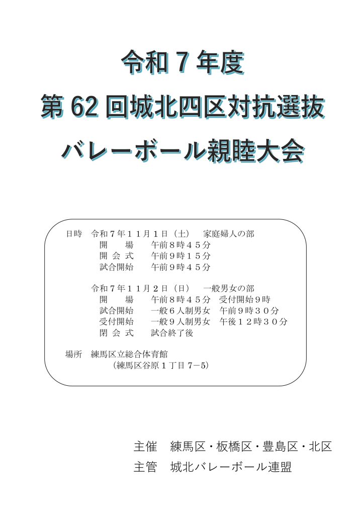 令和7年度第62回城北四区対抗選抜バレーボール親睦大会 2025年10月23日 最終更新日時 : 2025年10月23日 豊島区 バレーボール連盟 11月1日(土) 家庭婦人の部 11月2日(日) 一般男女の部 練馬区立総合体育館 R7城北四区選抜大会 プログラム表紙・裏表紙(大会役員)ダウンロード R7城北四区選抜大会 (トーナメント表)ダウンロード R7城北四区選抜大会(家庭婦人確認事項)ダウンロード Facebooktwitter
