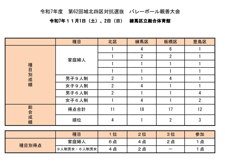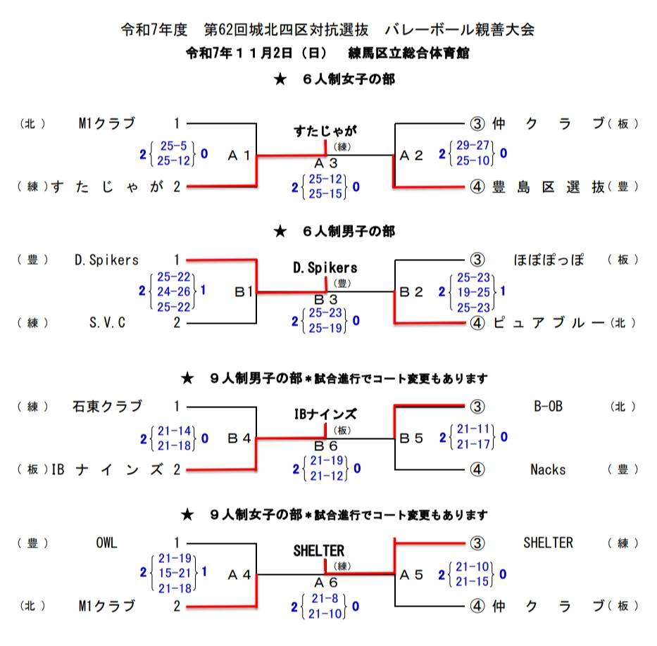 令和7年度第62回城北四区対抗選抜バレーボール親睦大会 結果 2025年10月23日 最終更新日時 : 2025年11月10日 豊島区 バレーボール連盟 11月1日(土) 家庭婦人の部 11月2日(日) 一般男女の部 練馬区立総合体育館 一般6人制男子 優勝 D. Spikers 一般6人制女子 準優勝 豊島区選抜 一般9人制男子 Nacks 一般9人制女子 OWL R7年第62回城北四区選抜大会 (結果表)ダウンロード Facebooktwitter